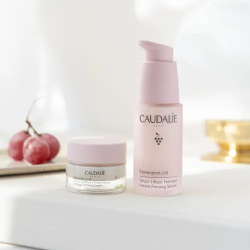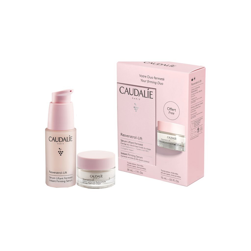 Caudalie Resveratrol Duo Anti -Pitietry Box 2022 está compuesto por 30 ml de suero reafirmante y 15 ml de crema de cachemira redisificante.