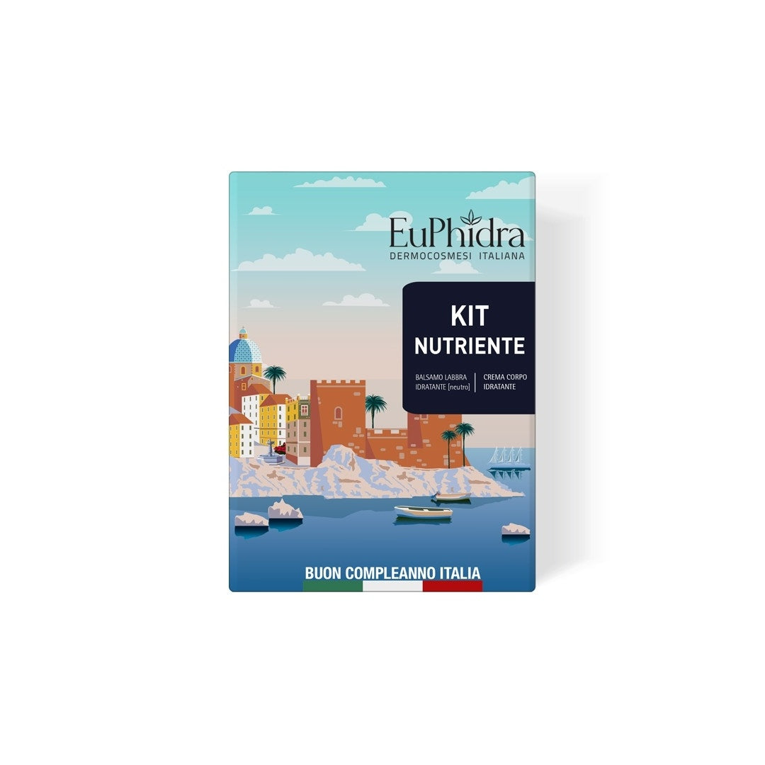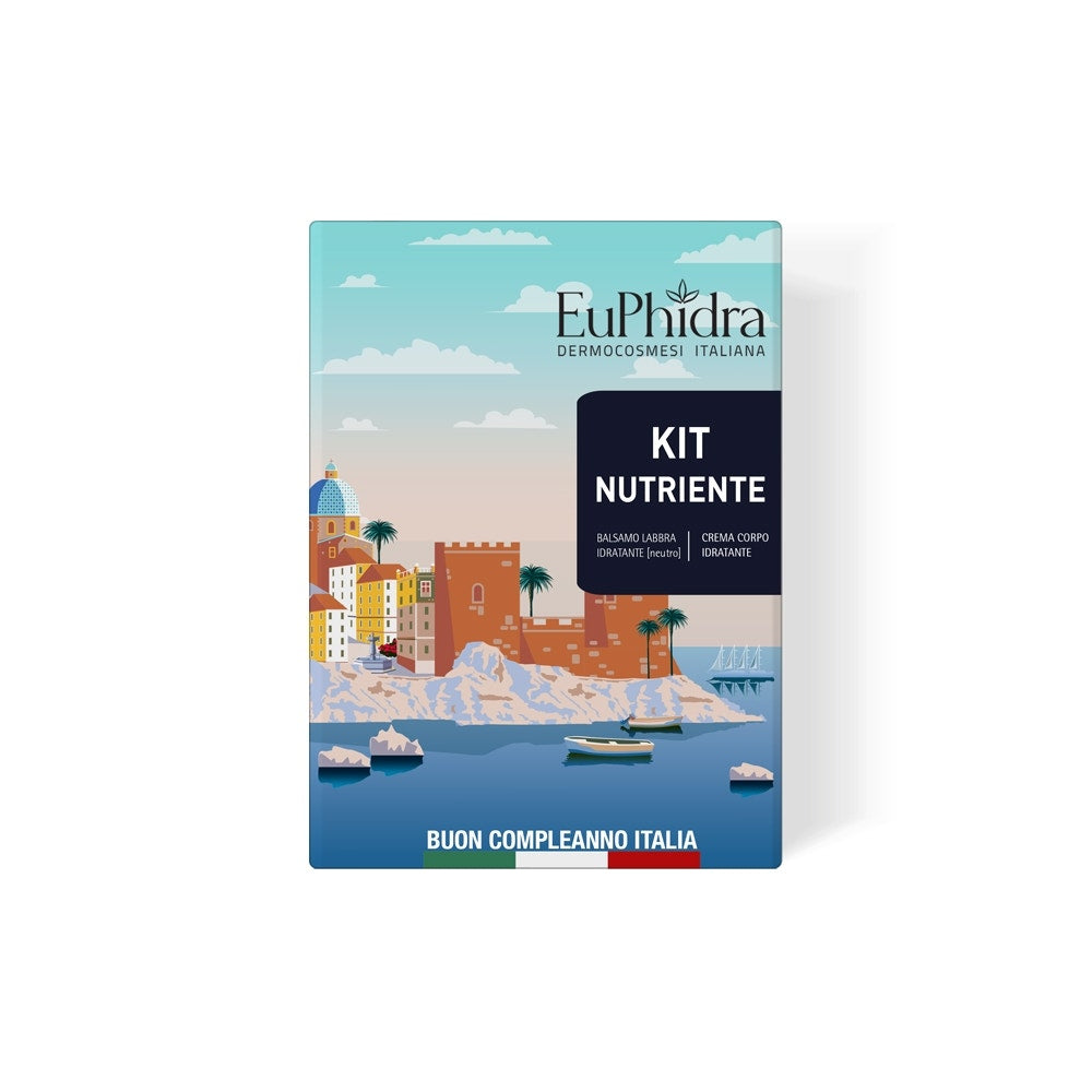La caja del kit Euphidra nurish contiene el bálsamo labial y la crema corporal que aseguran una hidratación profunda.
