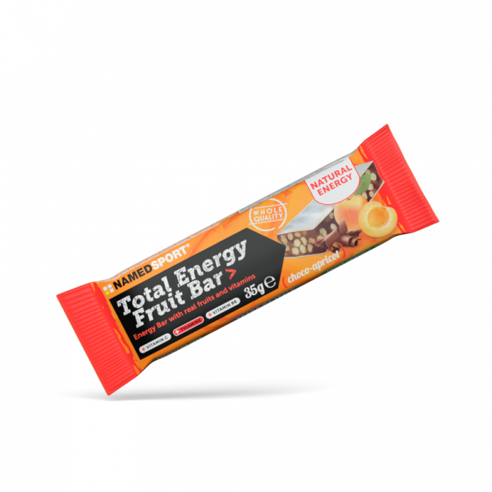 Nombrado Sport Total Energy Fruit Bar Choco Apricot es una barra de energía con cristpies de arroz y fruta real, enriquecida con vitaminas B1, B6 y vitamina C. Dentro de ella contiene mazapán (azúcar, almendras, jarabe de azúcar invertido, jarabe de glucosa; estabilizador: sorbitol; etilil alcohol), jarabe de glucosa, cristias de arroz (harina de arroz, azúcar, extracto de malta de cebada, sal), albaricoques deshidratados 15% (albaricoque 99%; conservante: dióxido de azufre), pasta de albaricoque 5% (50% de pulpa de albaricoque, azúcar, aromas; Estabilizador: pectina), maltodextrina, hojuelas de avena, copos de maíz (harina de maíz, azúcar, extracto de malta de cebada, sal), harina de arroz, 3% de pasta de sabor a chocolate [35% de chocolate en polvo (cacao, azúcar), aceites vegetales (girasol, coco, coco, coco nogal), polvo de cacao magro, aromas;emulsionante: lecitina de soja], ostie (almidón de papa, agua, aceite de girasol);conservante: sorbato de potasio;Distrosio, fructosa, caucho guar;Acidificante: ácido cítrico, aromas, polvo de remolacha, polvo de cúrcuma, vitamina C (ácido L-ascórbico), vitamina B1 (clorhidrato de tiamina), vitamina B6 (clorhidrato de piridosina).