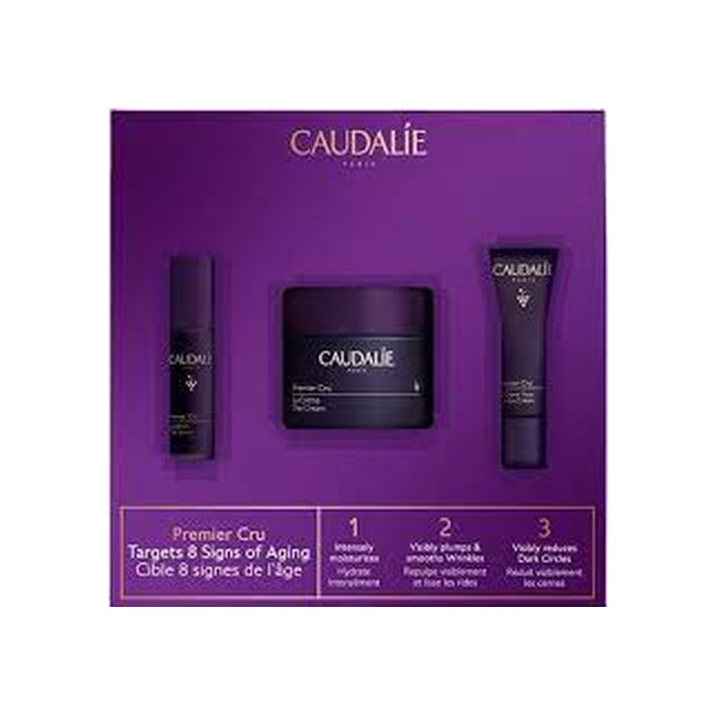 El primer ministro de Caudalie, Cru Boxet, está compuesto por: Caudalie Premier Cru The Cream 50ml Caudalie Premier Cru The Eye Area 5ml Caudalie Premier Cru The Cream Rich 15ml.